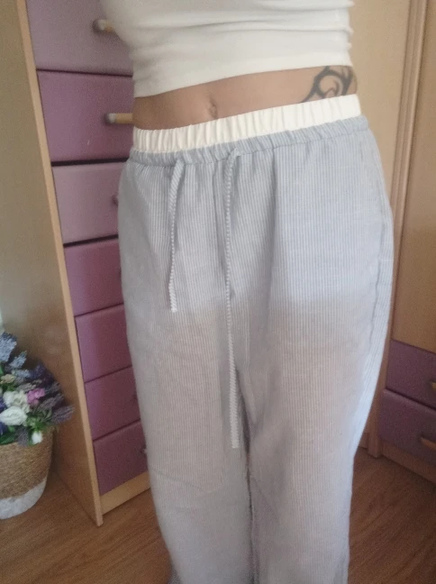 Diese Streifenhose ist der perfekte Allrounder für jedes Jahr. Mit ihrem weiten Bein und der lockeren Passform bietet sie sowohl Komfort als auch einen modischen Look. Der weiche Stoff sorgt für ein angenehmes Tragegefühl, während das stylische Design die Hose zu einem vielseitigen Klassiker macht, der sich für alle Jahreszeiten eignet. Ideal für lässige Outfits oder trendige Streetwear.